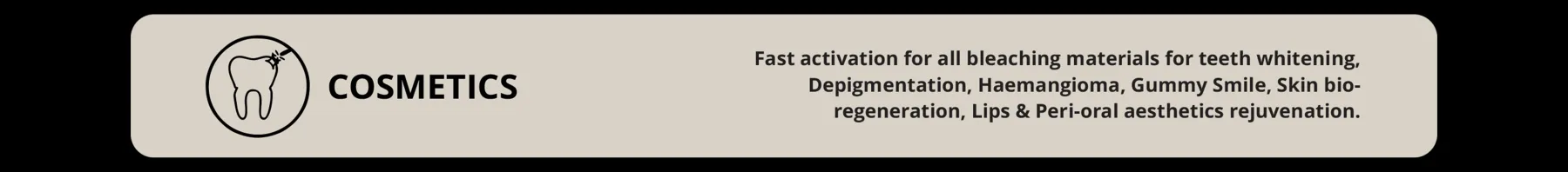 The WHITENING handpiece is mainly dedicated to bleaching procedures. The wide arch allows to fully cover each quadrant of the mouth, providing the best delivery of laser light in the quickest way.