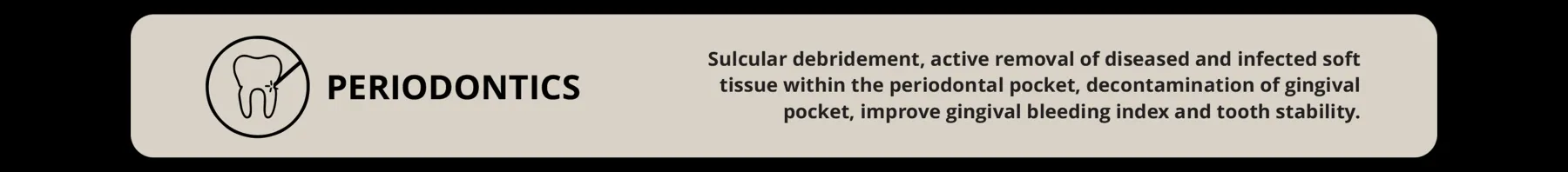 Preset treatments: Sulcular debridement active removal of diseased and infected soft tissue within the periodontal pocket, decontamination of gingival pocket, improve gingival bleeding index and tooth stability..