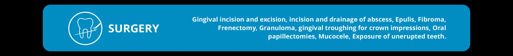 Preset treatments: Abscess, Gingivectomy, Depigmentation, Epulis, Fibroma, Frenectomy, Granuloma, gingival troughing for crown impressions, Haemangioma, Implant uncovering, Mucocele, Opercolectomy.